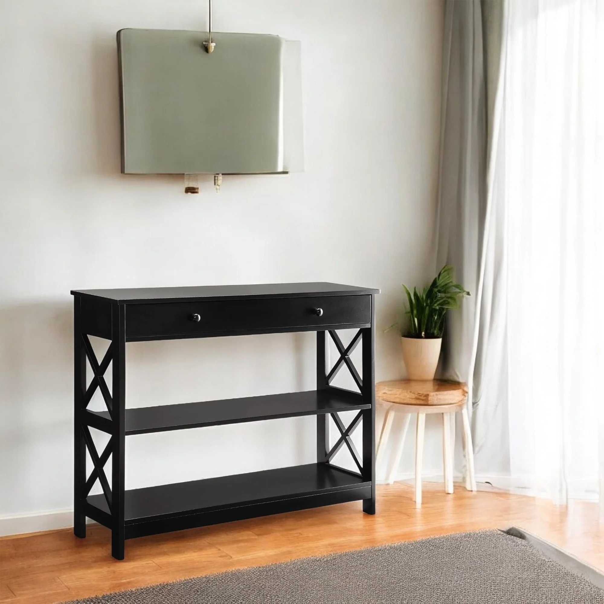 Console Table Black Drawer Open Shelves Elegant Entryway