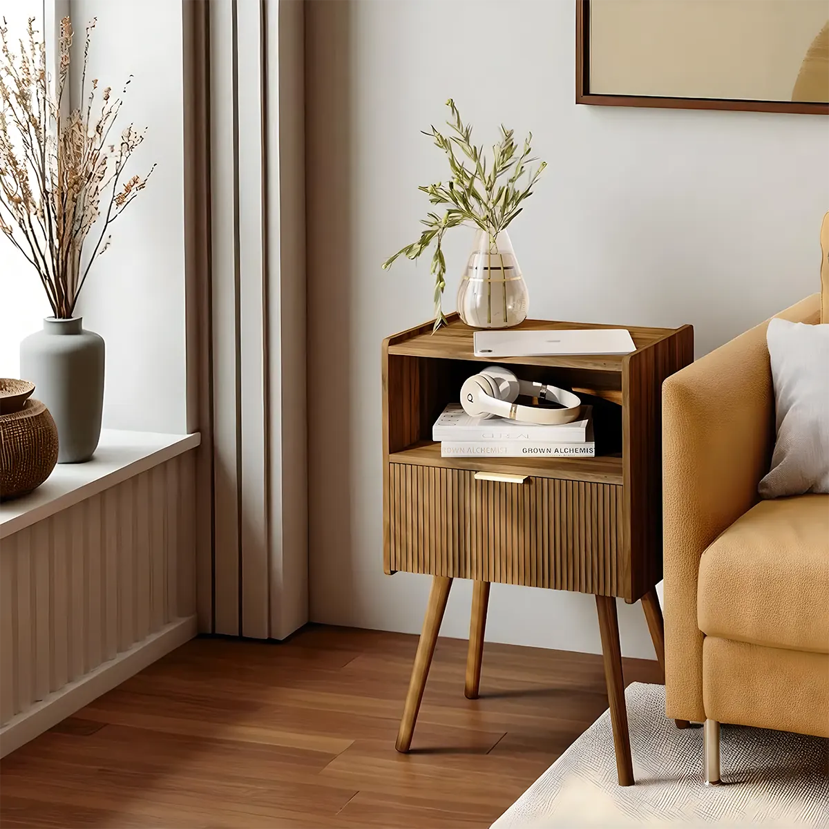 This mid century end table in warm brown wood brings a refined retro note to a bedside or sofa. The smooth top holds a lamp a book and a glass while the open shelf keeps nighttime items within reach. Tapered legs and clean edges echo classic design and sit lightly in modern rooms. The compact footprint fits studio apartments and guest spaces without crowding.