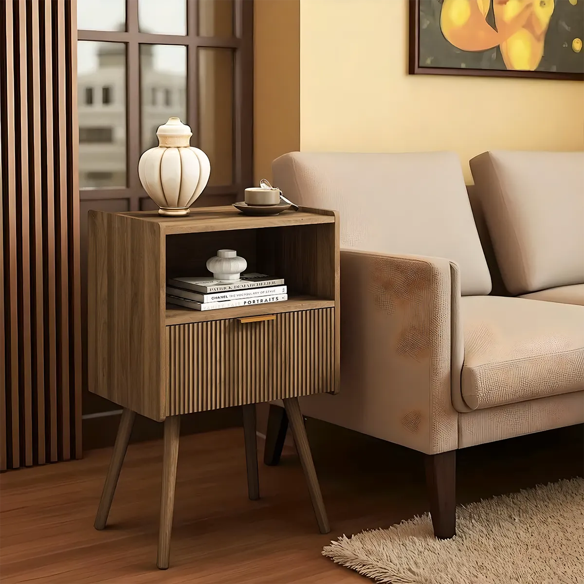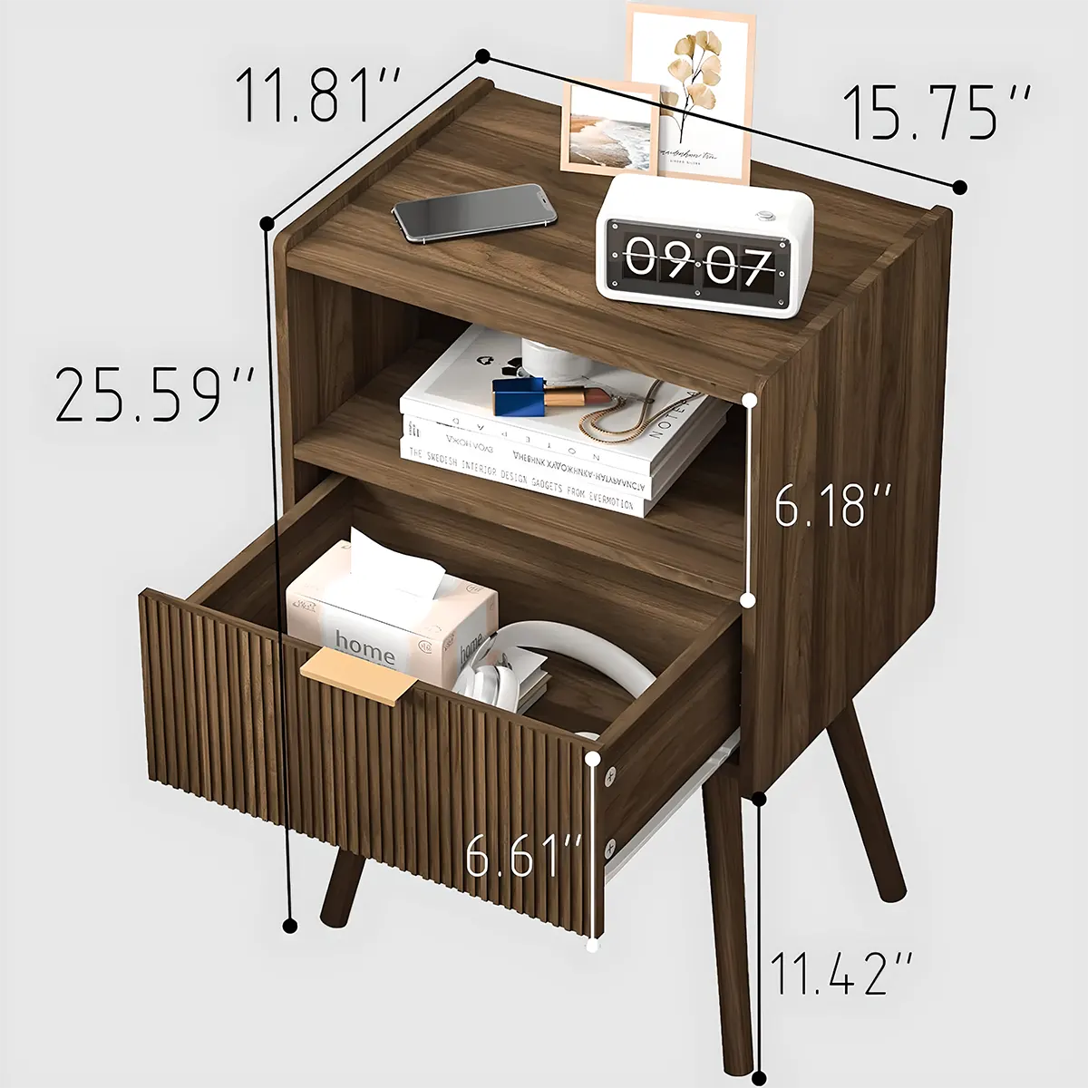Mid Century End Table Brown Wood Retro Bedside Shelf