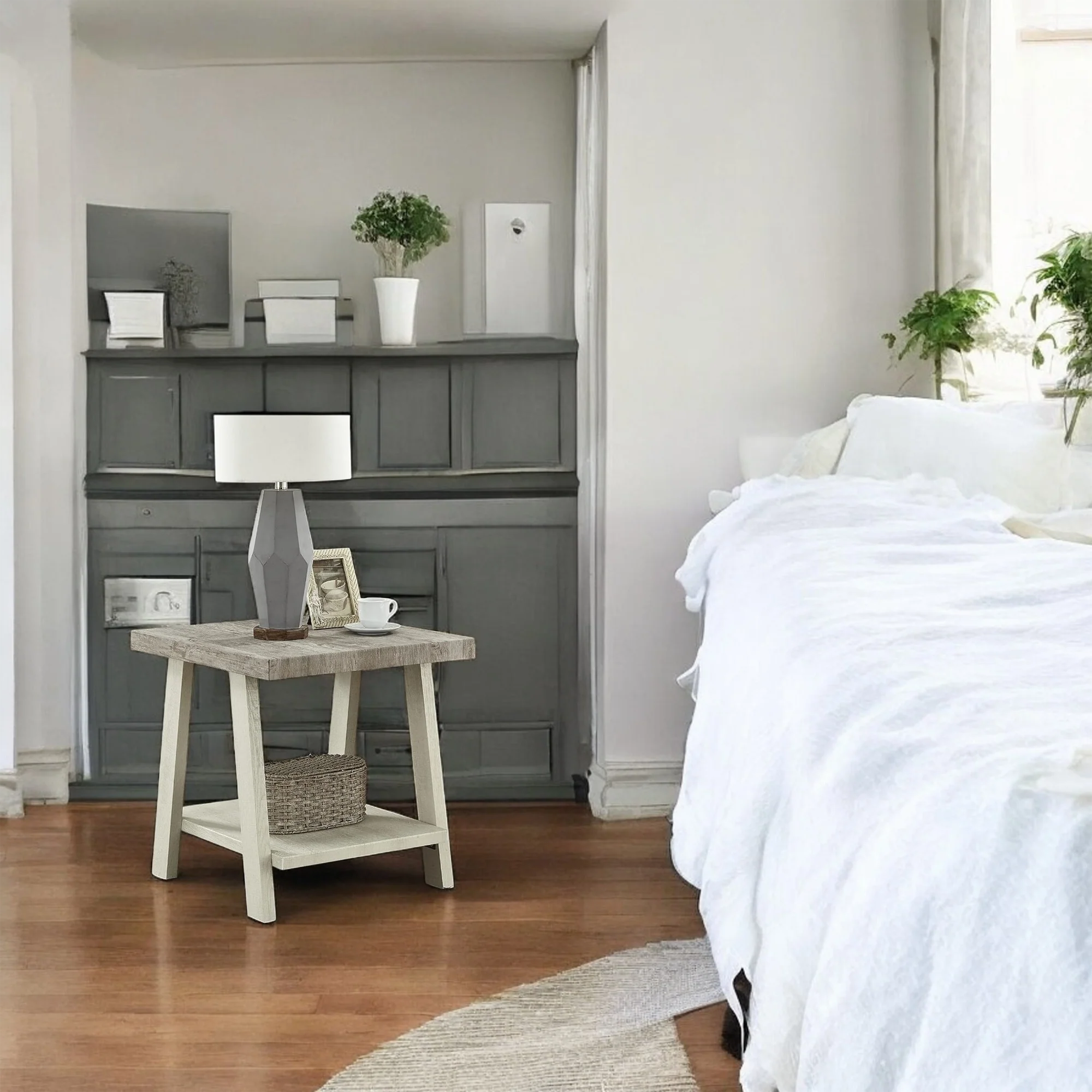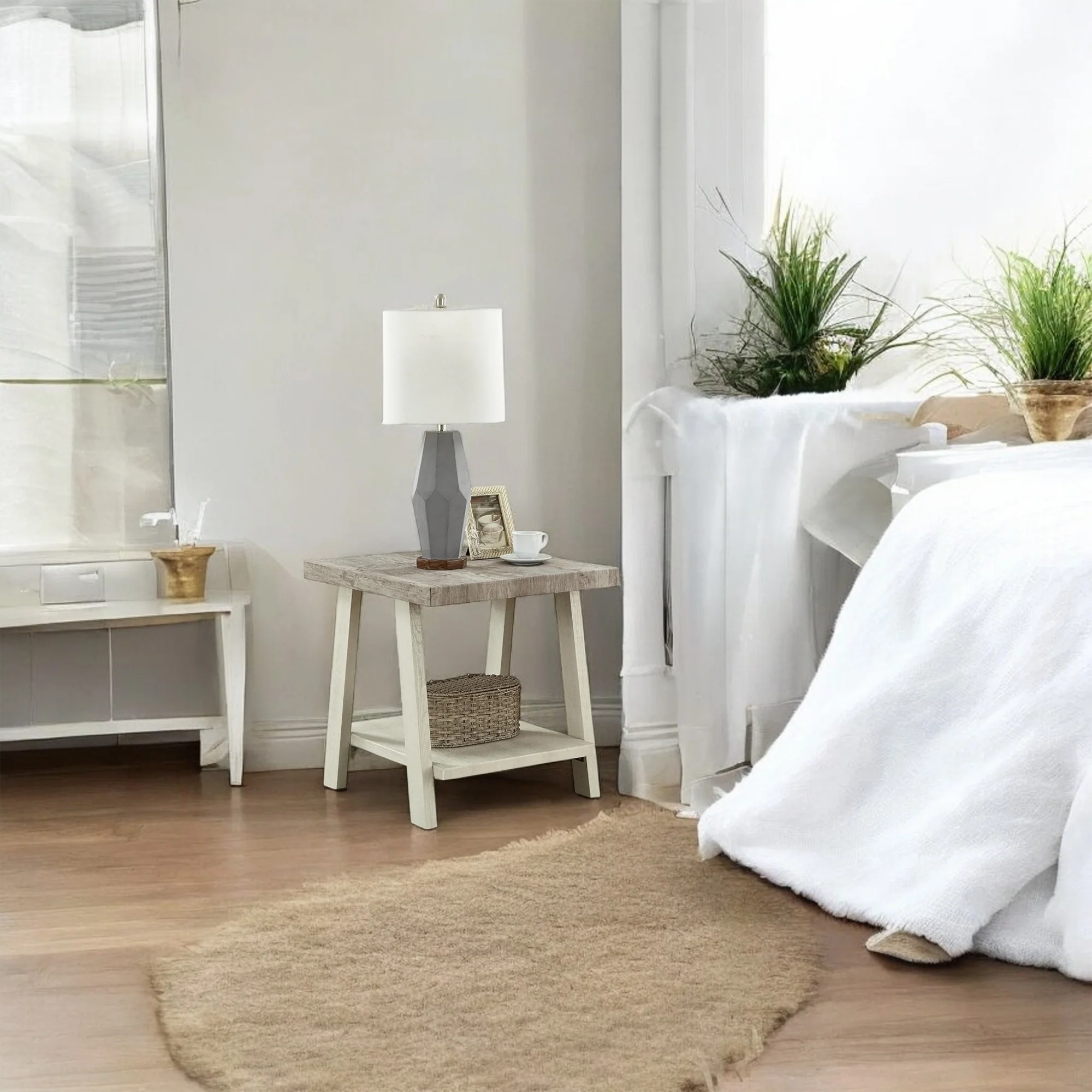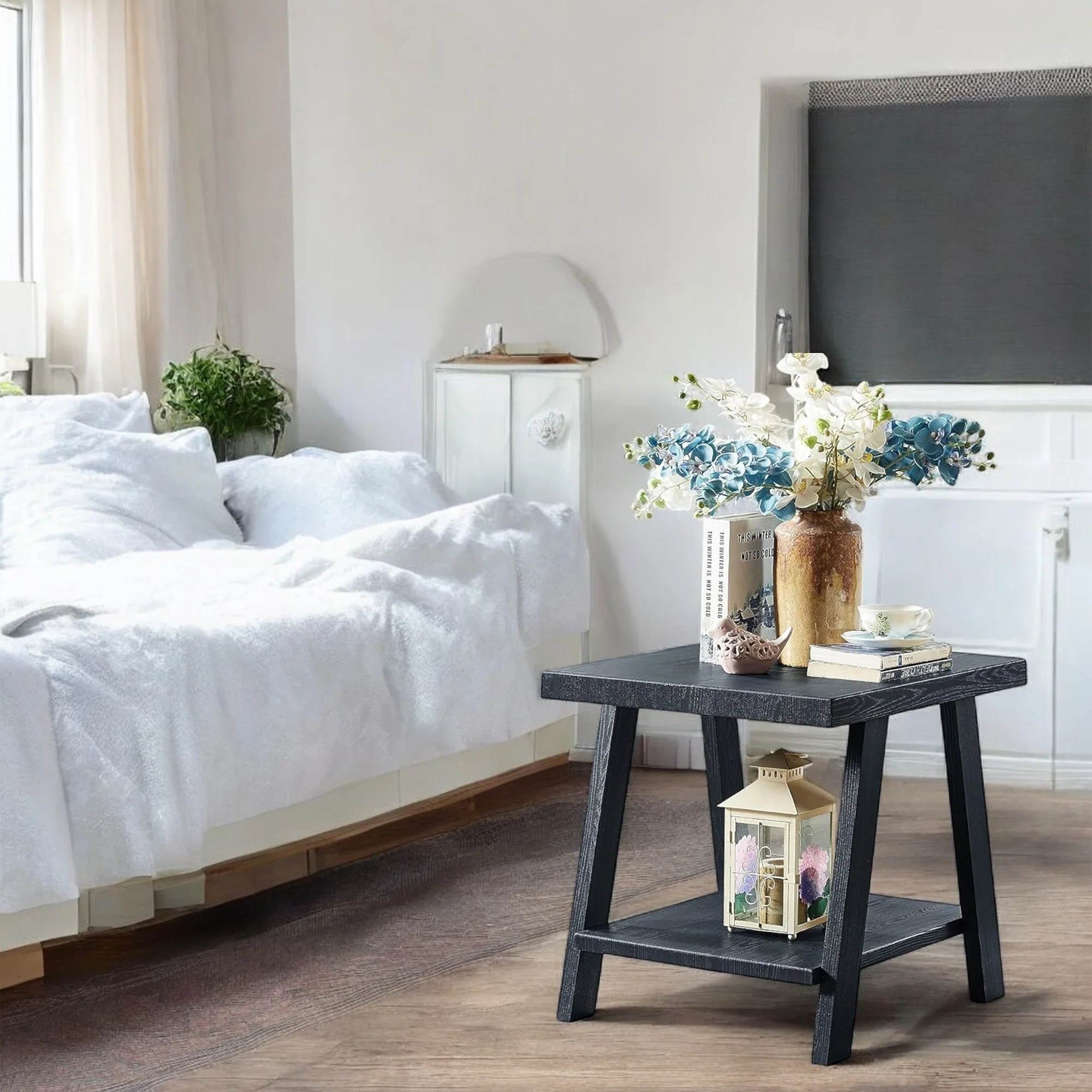 This table works well as a nightstand in a guest room or as an end table in a family space. Style it with a ceramic lamp a framed photo and a small tray to corral everyday items. The open shelf keeps clutter off the top so the space feels calm and organized.